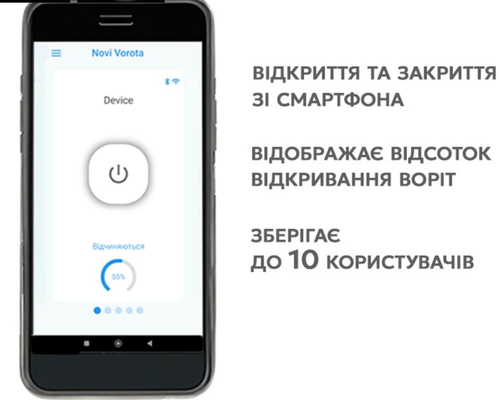Спеціалізований застосунок надає повний контроль над системою. Інтуїтивно зрозумілий інтерфейс дозволяє керувати воротами одним дотиком, при цьому застосунок відображає поточний стан системи в режимі реального часу.
